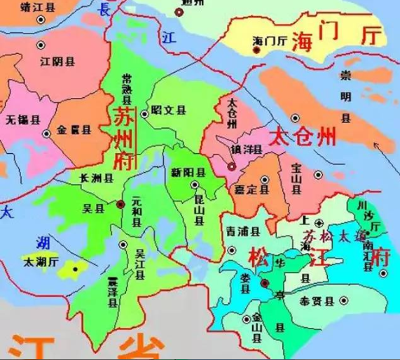 最后一次拆分则是在明清时期,江南的经济中心地位更为巩固。明朝初期从苏州府的昆山县中析出太仓散州,与“县”同级,交给苏州府管理。