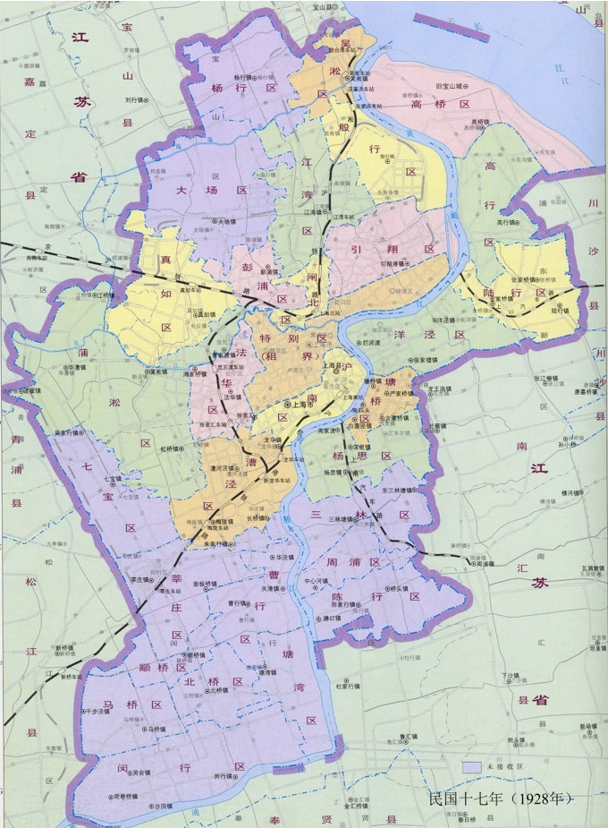 ▲1928年上海特别市地图,紫色区域为规划市区,但最终未划入上海市