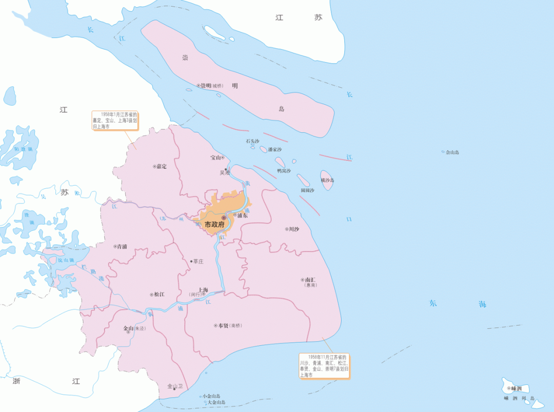 1958年,上海吸收江苏10县,最终将上海市与江苏省的边界定格在了太仓市-昆山市一带。