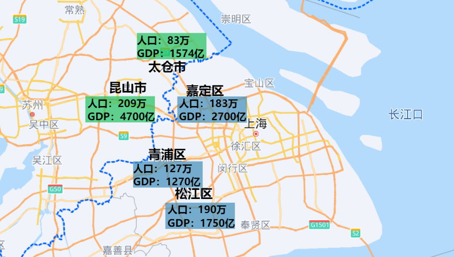 ▲沪苏省界的五市(区)经济与人口对比