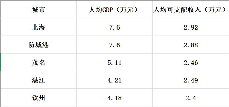 2020年,北海、防城港两市的人均GDP和可支配收入,比隔壁的湛江、茂名两市要高。