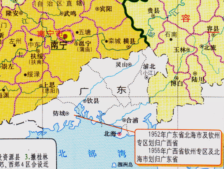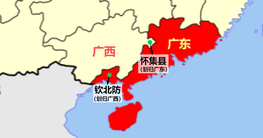 直到新中国时期,广西才重新变回沿海省份。1952年,广西用一个内陆县——怀集县,换来广东近海的合浦县、钦县、防城县、灵山县、北海市共四县一市(今钦北防三个地级市),共约1600公里的海岸线。