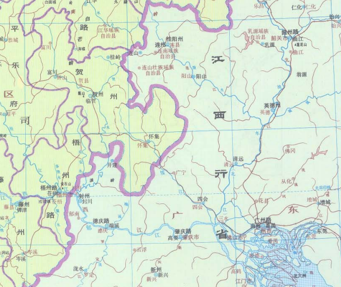 广西家业庞大,包括海南岛和雷州半岛,拿到岭南地区超过一半的海岸线。两广陆地的北部省界与现在无太大区别,当时的怀集县也隶属广南东路的广州。
