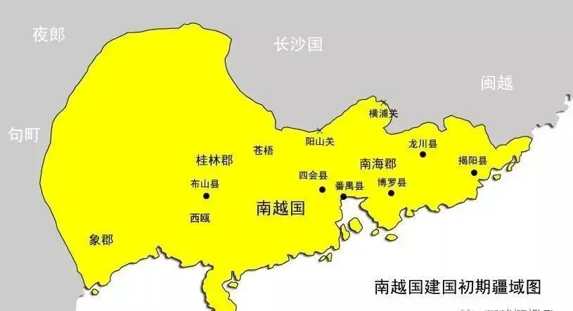 秦朝暴政,不久便灭亡。南海郡尉赵佗趁机扩大自己的地盘,占领桂林郡和象郡,封锁与中原的道路,于公元前204年建立“南越国”,首都在番禺(今广州)。