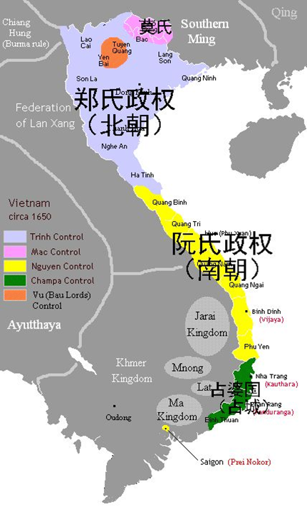 在后续的发展中,郑氏消灭莫朝,阮氏攻灭残存的占城国,建立广南阮主政权,双方名义上都尊后黎朝皇帝,形成南北对峙,史称“郑阮纷争”。