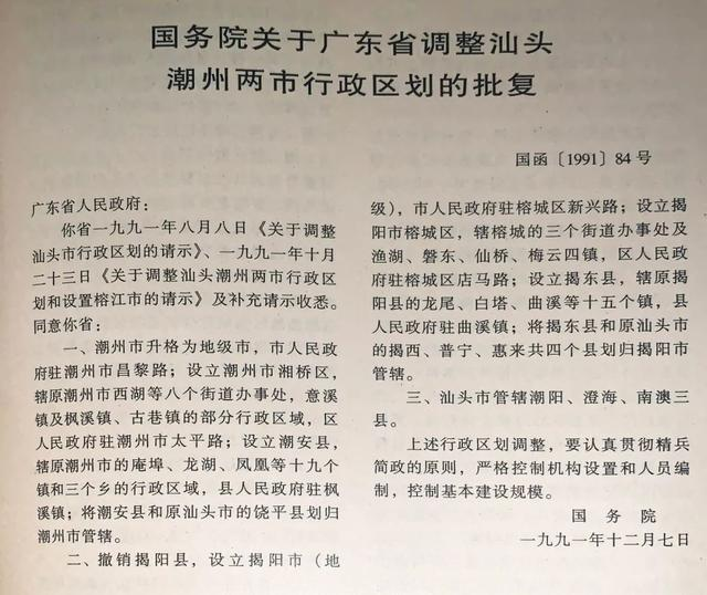 1991年12月,方案得到落实,成立汕头、潮州、揭阳三个地级市,汕头特区扩大到城区,达234平方公里。