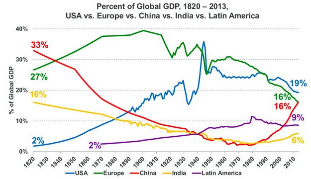 ▲外国学者的GDP预估,红色为中国(1820年占世界份额33%),蓝色为美国,绿色为欧洲