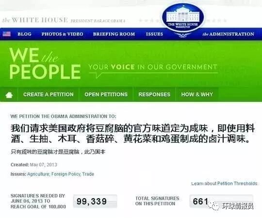 然而越是这样一个美食文化悠久,派系林立的国家,其间的斗争从未停息过,所以才在2013年发生了甜咸豆脑之争的战火一直烧到了美国白宫的事件,甜咸豆腐脑党在美国白宫分别进行请愿,咸党请求美国政府将豆腐脑的官方味道定为咸味,即使用料酒、生抽、木耳、香菇碎、黄花菜和鸡蛋制成的卤汁调味。只有咸味的豆腐脑才是豆腐脑,此乃国本。