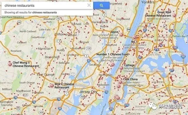 ▲在谷歌地图上,搜索美国地区的中餐厅以后的结果,请感受一下那密密麻麻的红点
