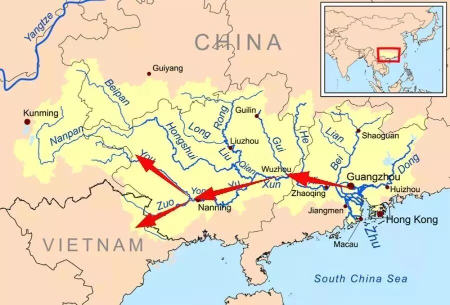 ▲广东商人沿西江西进示意图,最远能到达广西与云南、越南的边境地区。现在的西江沿岸仍然分布着大大小小的粤语城市和集镇。