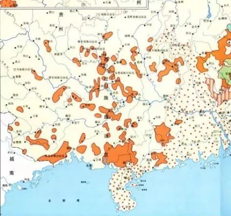 ▲客家话(橙色部分)星罗棋布的分布在广西全境