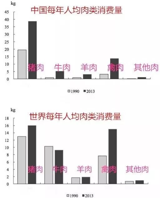 ▲中国和世界每年人均肉类消费量对比图,猪始终是中国人最主要的肉食来源