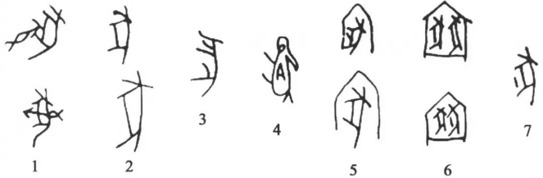 ▲殷墟甲骨文中关于猪的文字。1.彘,野猪;2.豕,家猪;3.豭,公猪;4.豚,肥猪;5.家;6.囫,圈养之意;7.豖,被阉割的猪