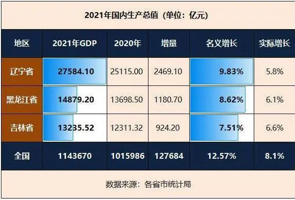 进入21世纪以后,东北三省的发展渐渐落后于其他省份,尤其是吉林省。2021年,吉林省的GDP在东北三省中垫底,仅是辽宁省的一半。