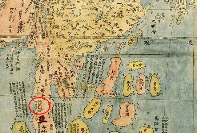 ▲明朝绘制的《万国坤舆全图》上标注有旧港宣慰司