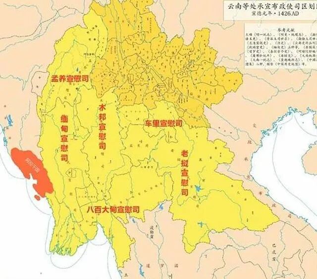 明朝后来将这些宣慰司整合为“三宣六慰”,“三宣”指南甸、干崖、陇川,三个宣抚司,“六慰”指的是车里、缅甸、木邦、八百大甸、孟养、老挝,六个宣慰司。