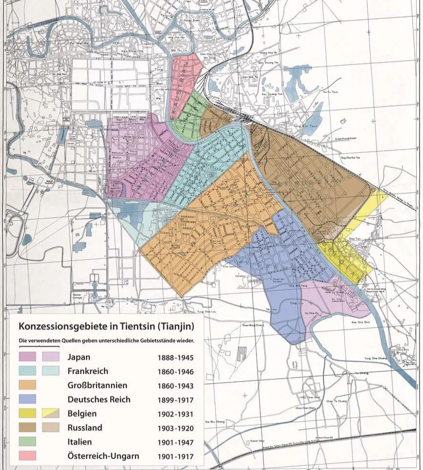 先后共有九国开辟天津租界,租界区几乎占清末民国天津市区一半面积,为中国城市租界区面积之最。
