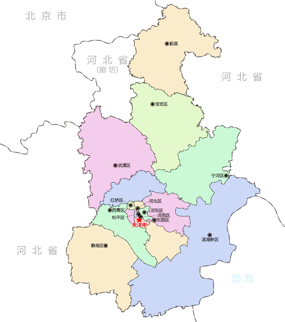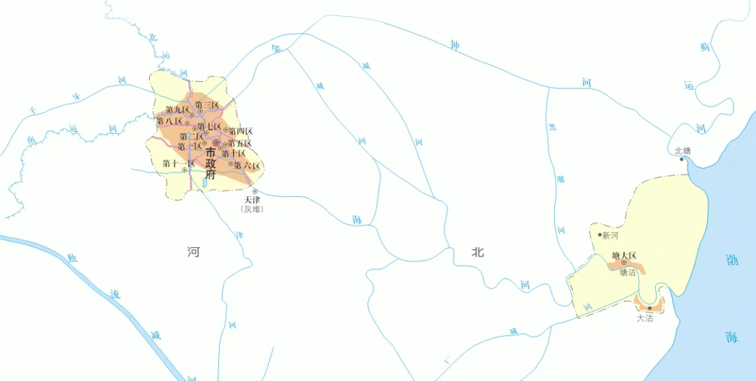 ▲2009年前的天津市政区图,2009年汉沽区、塘沽区和大港区合并为滨海新区