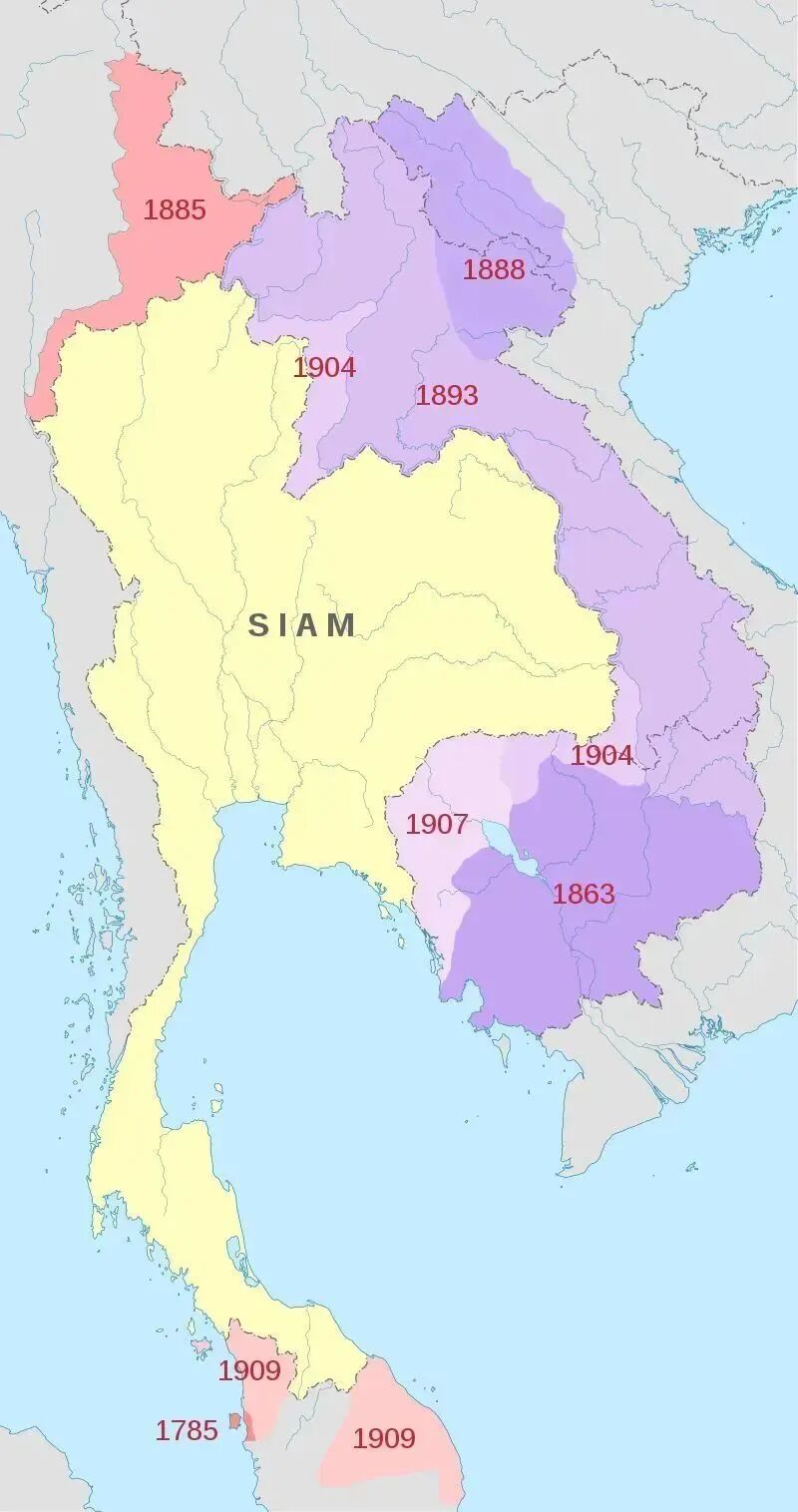 ▲英法在中南半岛的殖民过程,其中只有泰国(黄色)保持了独立