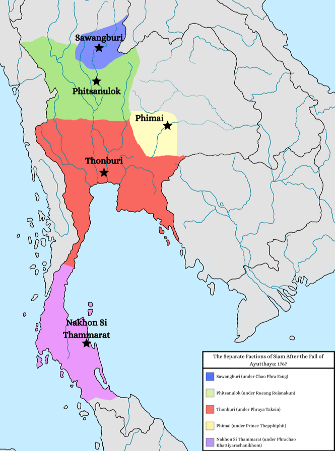 而阿瑜陀耶灭亡之后,泰国分裂成五个部分,郑信控制着东南沿海,以春武里和庄他武里为根据地。