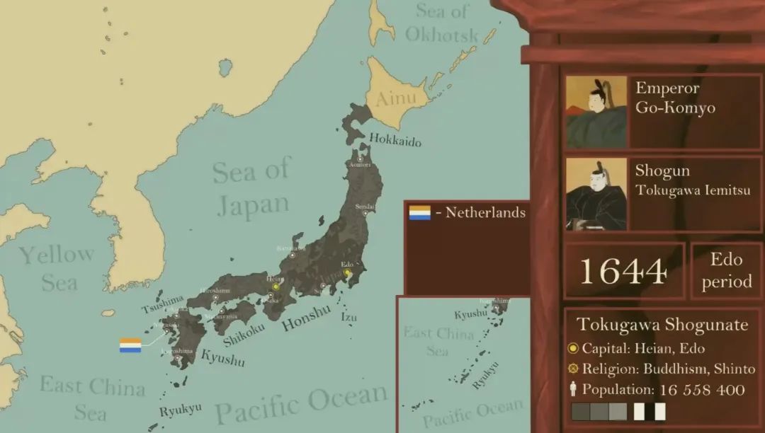 早在1635年,松前藩派村上扫部左卫门考察库页岛。而在清军入关这一年,松前藩绘制地图《正保御国绘图》时,首次将北海道与库页岛纳为日本领土。