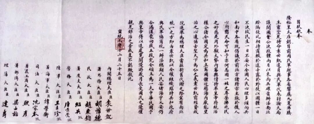 在袁世凯的威逼利诱下,清室隆裕太后无力反驳。1912年2月12日,6岁的宣统帝溥仪颁布退位诏书,延续两千多年的封建帝制就此终结。