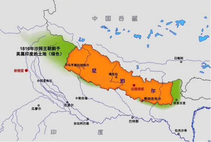 英国首先盯上了喜马拉雅山南麓的尼泊尔,1814年英国对尼泊尔发动战争,两年后迫使其接受英国的“保护”,内政外交都被英国人把持,成为英国殖民地。