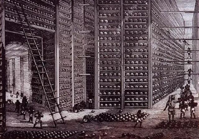▲英国东印度公司仓库里准备销往中国的鸦片