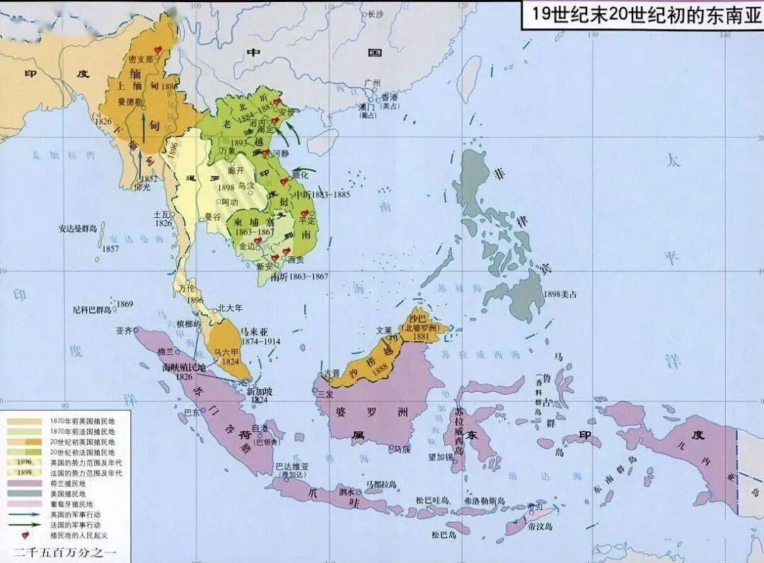 1884年,兰芳共和国被荷兰人吞并。至19世纪初,荷兰人已控制今印度尼西亚全境,称荷属东印度。英国吞并了东南亚的缅甸、马来亚等地,法国则吃掉了越南、柬埔寨和老挝,仅泰国维持着名义独立。