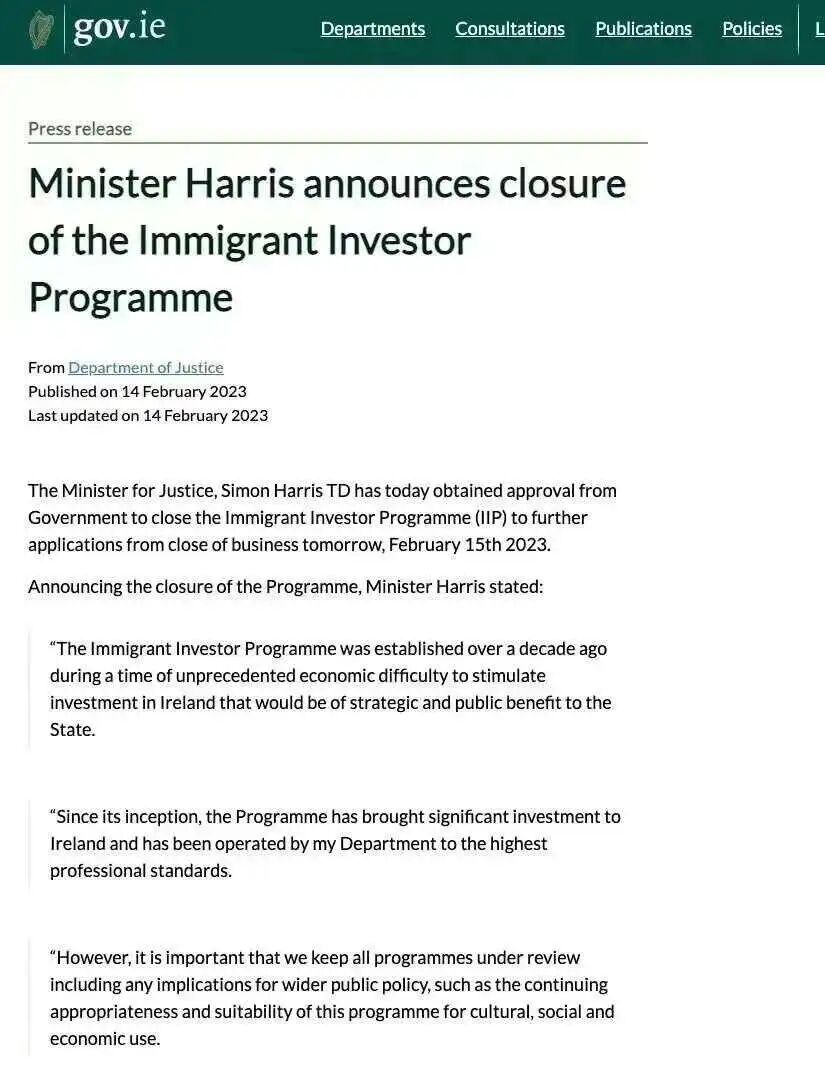 首先是爱尔兰,2023年2月15日,爱尔兰政府突然发布消息,宣布关停投资移民通道,除了已经递交的客户不受影响,新的申请人只有不到三个月的缓冲期,而且根据当地媒体的报道,爱尔兰大概率是永久性的关停这个项目!