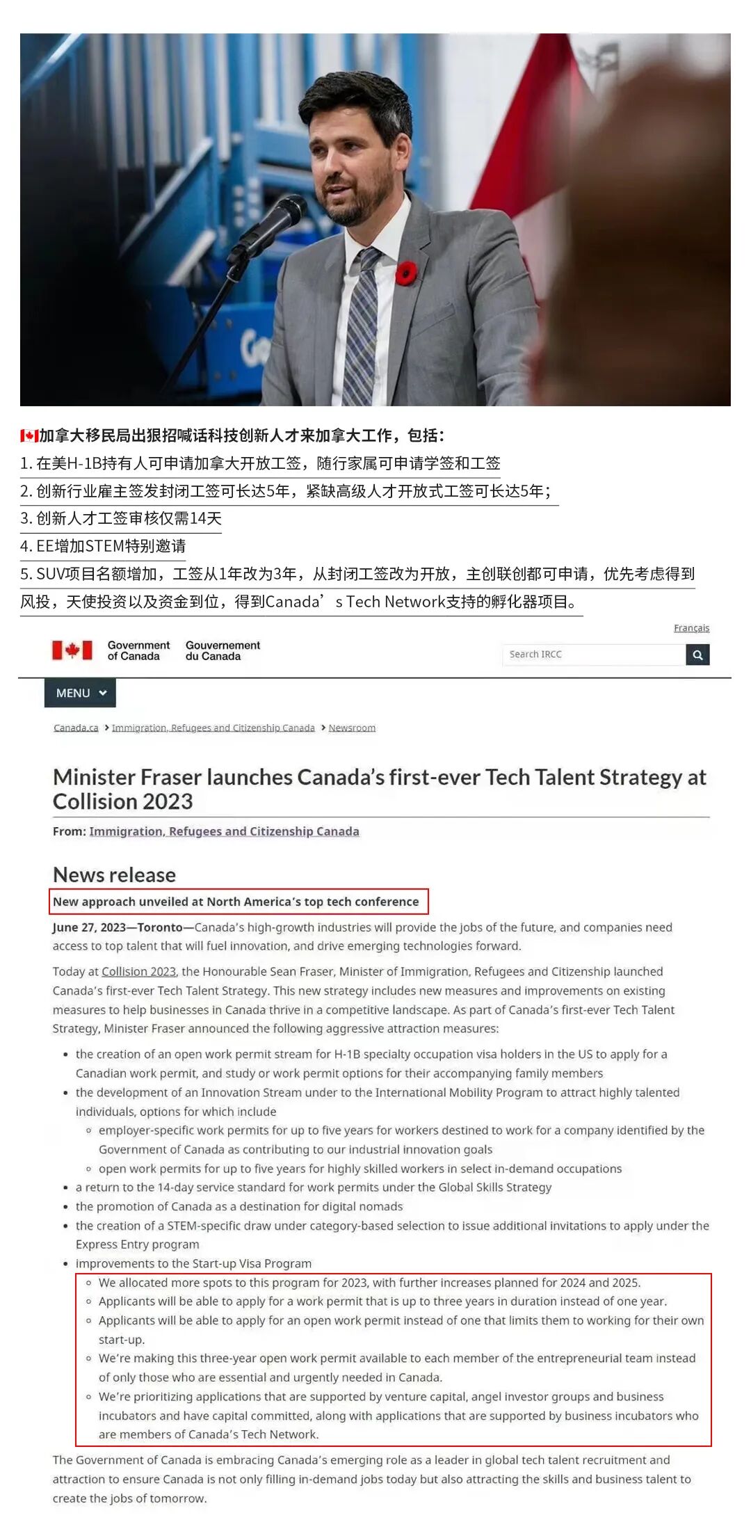 北美时间6月27日,加拿大移民部长宣布了多项新的临时措施,重点吸纳科技创新人才,内容主要包括以下几项: