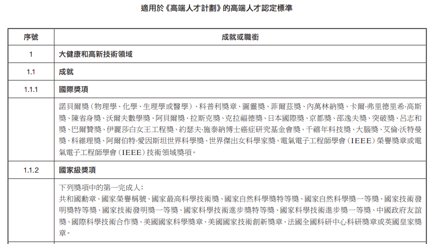 对标香港优才的成就计分制,基本上都得属于行业顶尖大牛才有机会获批,像奥运冠军、诺贝尔奖获得者、共和国勋章获得者等等。
