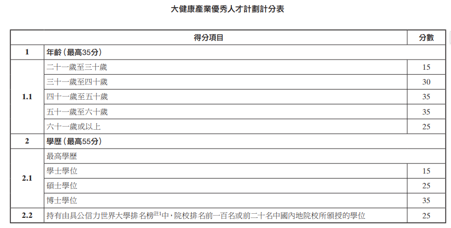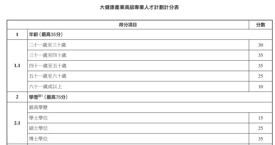 澳门大健康產業高級專業人才計劃部分分值参考: