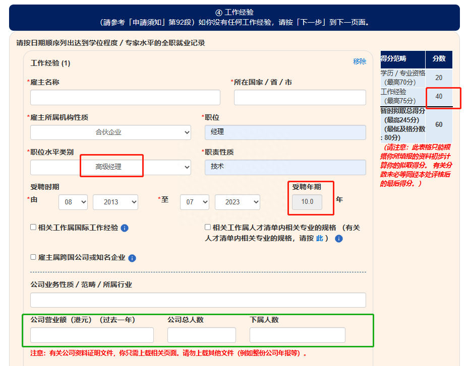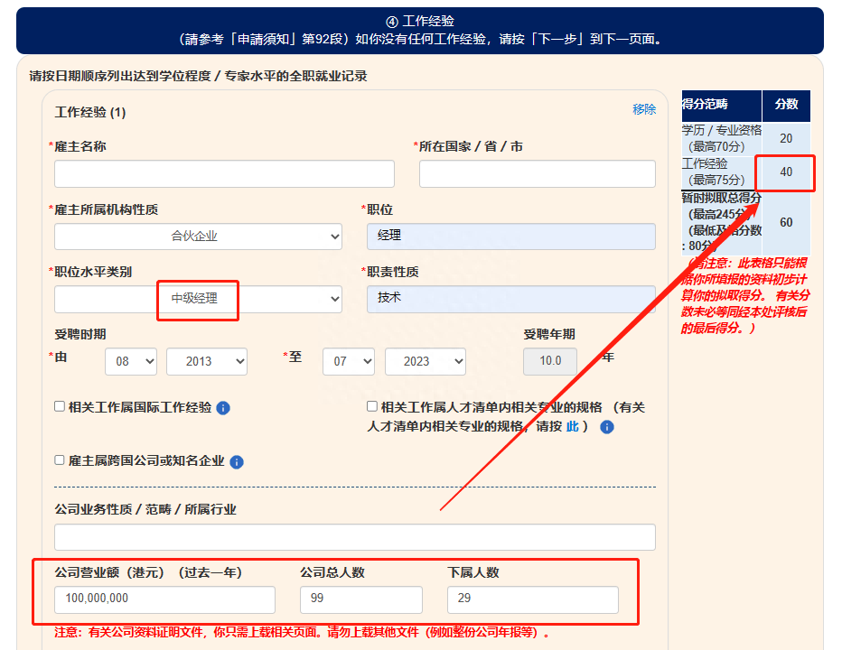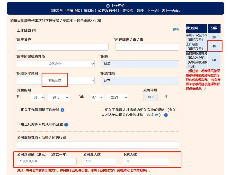 如存款证明金额,高级管理经验评定等,其中高级管理经验的分数认定有三个条件,需要同时满足才能获得额外的15-25分: