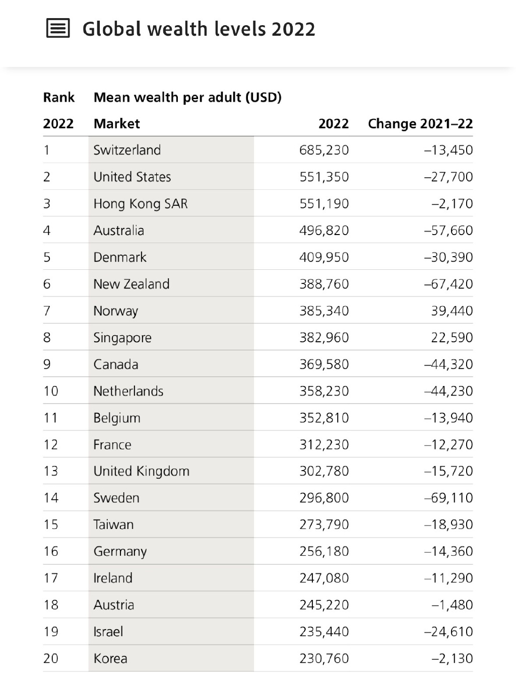 以下这张图是2022年人均财富排名,可以看到,榜上有名的基本上都是全球知名的发达国家和地区: