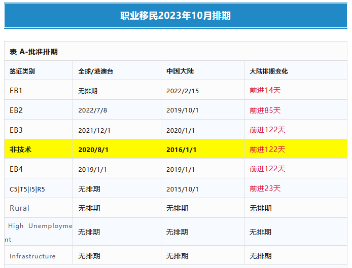 就像最近一次10月份的排期表,上面显示中国大陆申请人的EB3非技术移民排期是2016年1月1日,