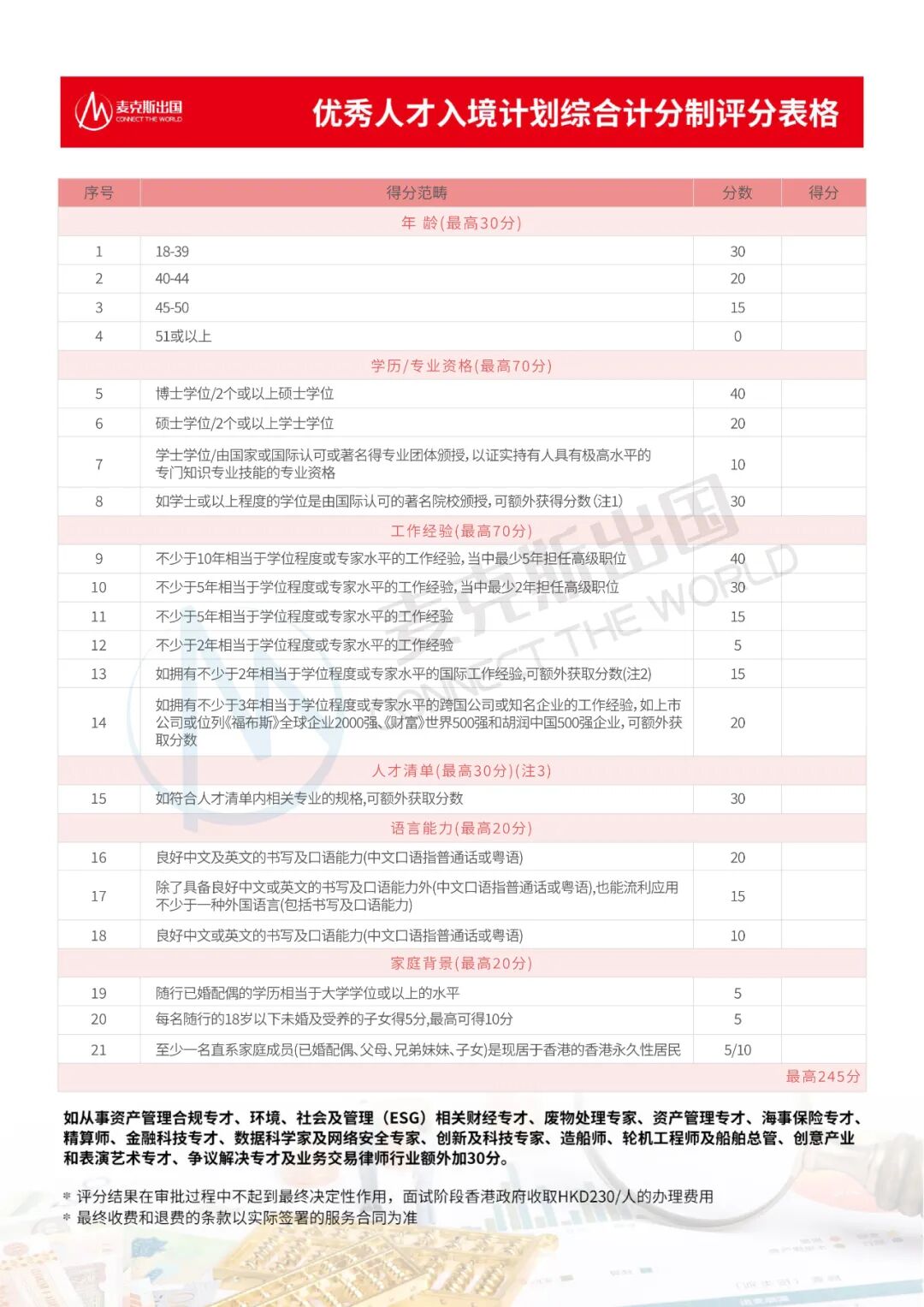 香港优才总分245分,80分以上获得申请资格,择优录取,对个人资产、年龄、工作背景等都没有硬性的要求。