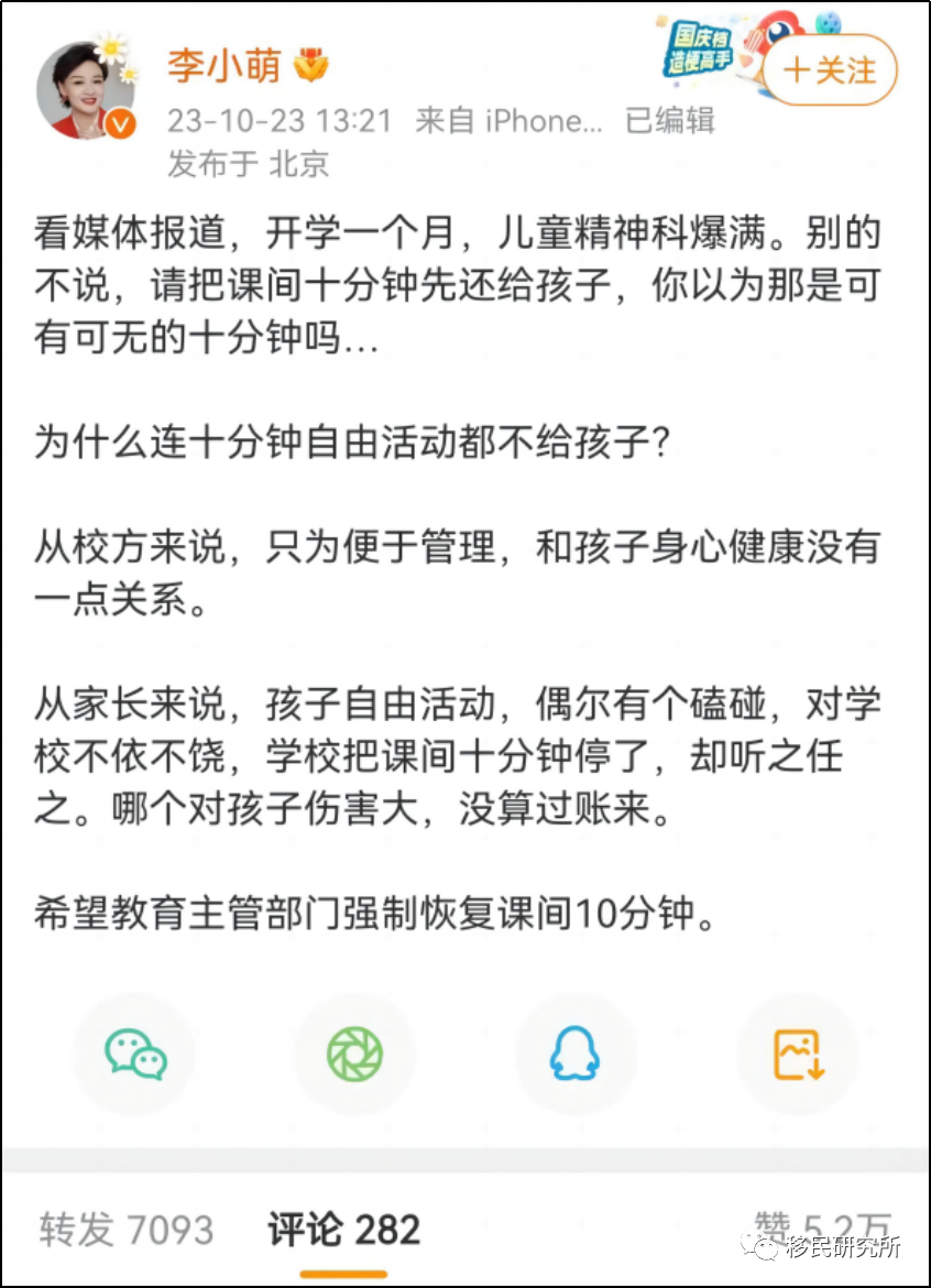 最近,前央视主持人李小萌在社交媒体上呼吁教育主管部门强制恢复课间十分钟。