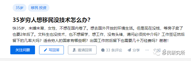 这两天在网上看到一个问题:35岁穷人想移民没技术怎么办?题主表示快35岁了,目前未婚,不想在国内卷下去了,想去国外躺平。