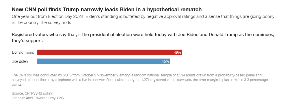 有趣的是,根据美国媒体最新的一项民意调查显示,特朗普的支持率居然比现任总统拜登要高出4%!