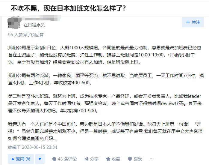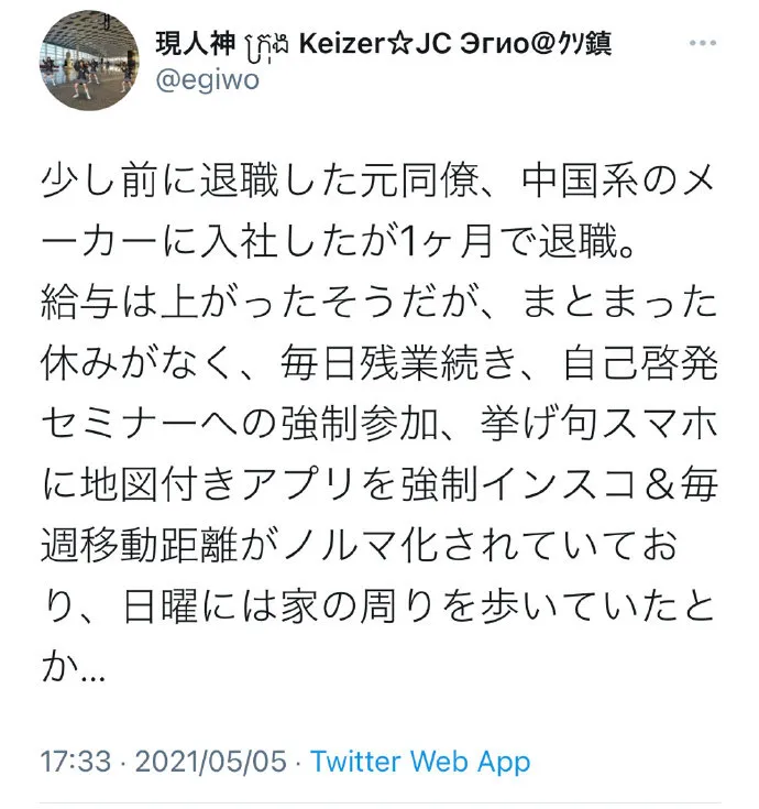 说到这还有个有意思的小故事,2021年有个日本网友来中国的一家公司上班,结果一个月之后受不了走人了。