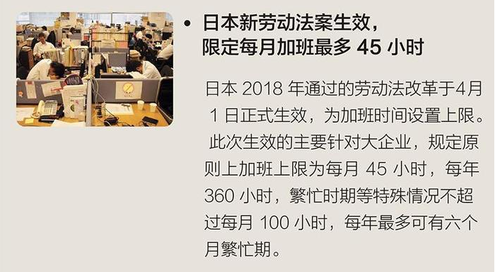 比如2018年日本新劳动法就规定企业员工每个月加班的时长不能超过45小时,每年不得超过360小时。
