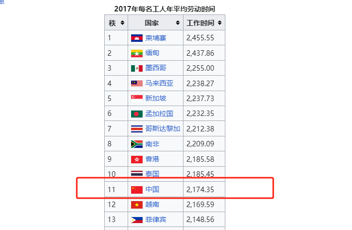 而中国排在全球第11位,平均年工时为2174.35小时,换算下来平均每人每周需要工作41.8个小时。