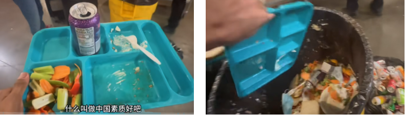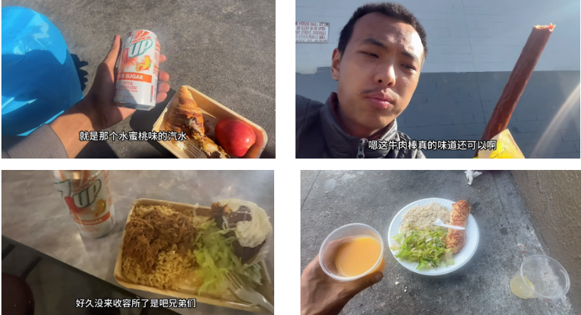 但讲师视频里所展现的救济食品是什么呢?鸡腿、沙拉、水果、汉堡薯条、汽水,一天三餐都不重样的。很多人甚至在视频底下留言,说吃得比国内的打工人还要好。