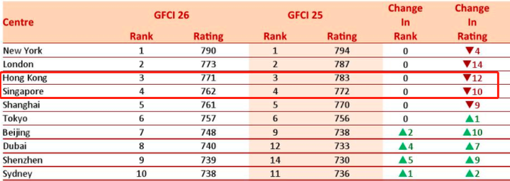可以看到香港依然在全球十大金融中心的排行榜里边,并且名列第四位。