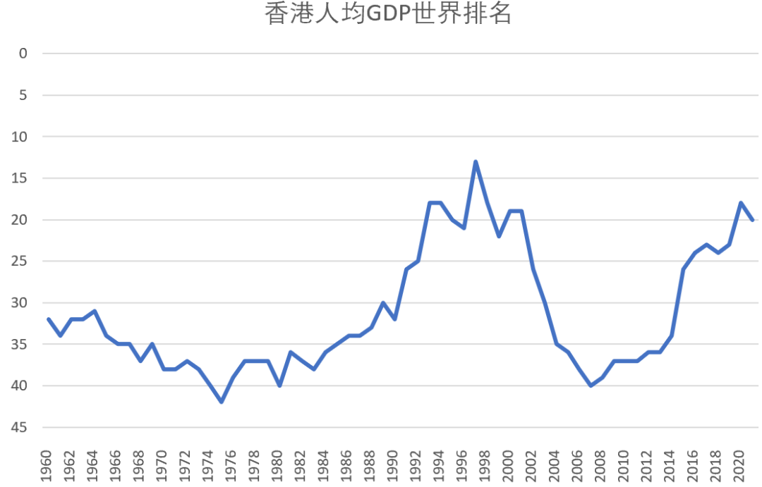 其次,从全球范围来看,香港从1985年确定回归后,人均GDP排名一直都在提升。