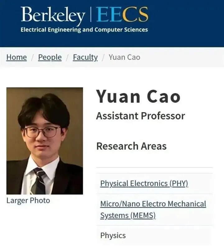 加州大学伯克利分校(UCB)官网显示,曹原将于2024年7月起正式担任该校电子工程与计算机科学系助理教授。
