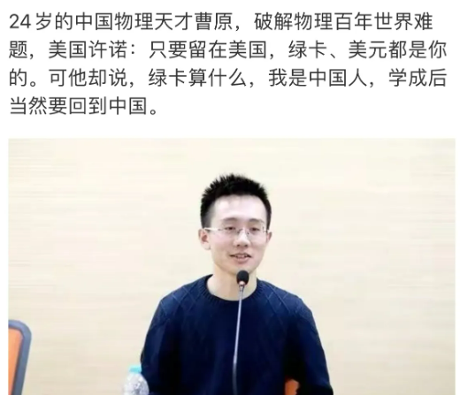 况且曹原也在公开场合表示,自己学成之后就会回国效力,不会加入美国国籍的,因此大家也可以放一百个心。