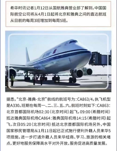 根据国航雅典营业部的消息,从今年4月开始,北京和雅典之间的直达航班将会从每周3趟增加至每周5趟。