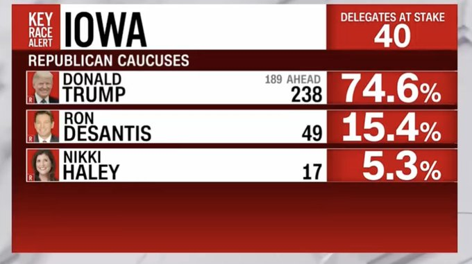 北美时间2024年1月15日,“懂王”特朗普以碾压般的优势赢得了艾奥瓦州共和党党内初选,得票率高达74.6%!